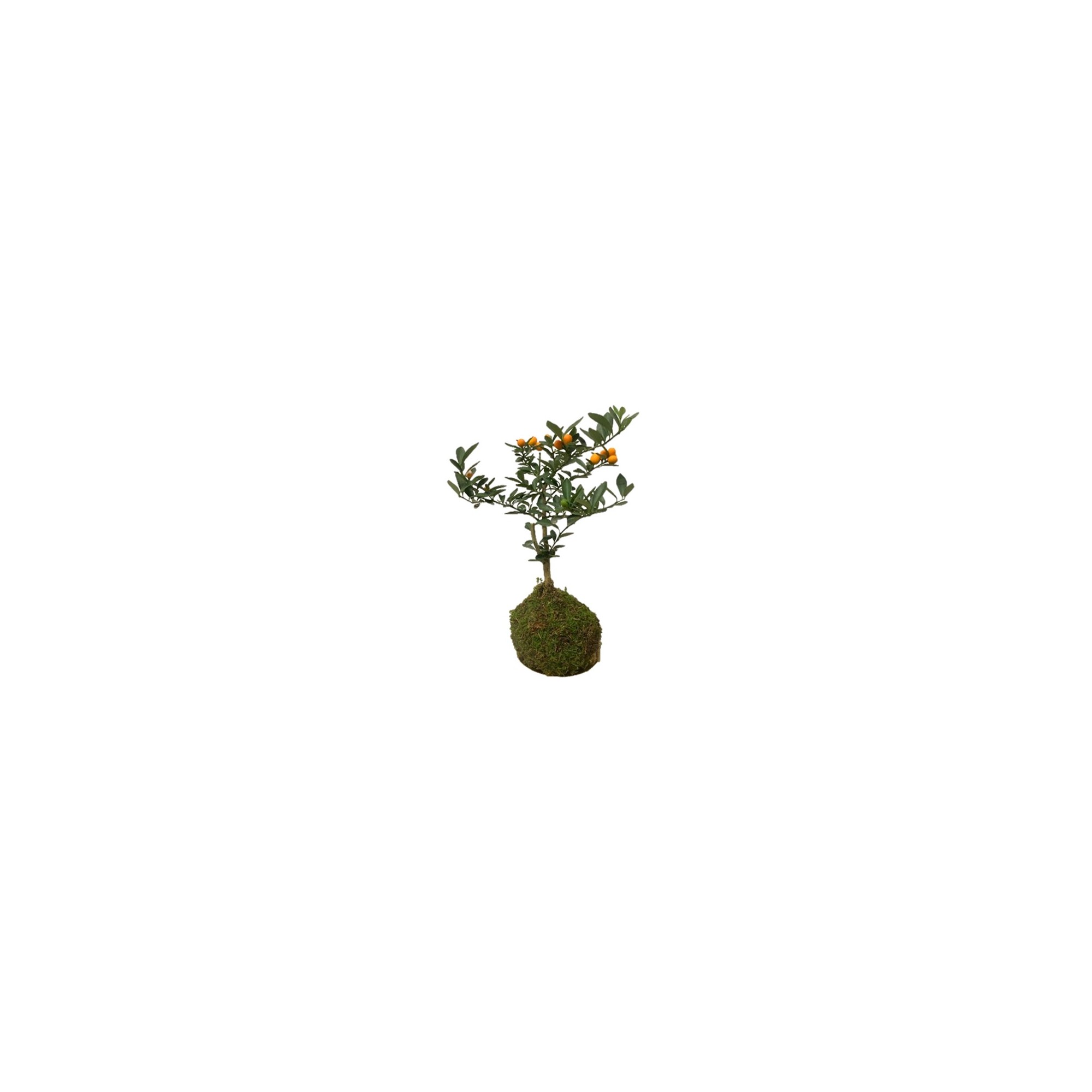 - This Kokedama features the Fortunella, a citrus plant known for its small, vibrant orange fruits that resemble miniature oranges.